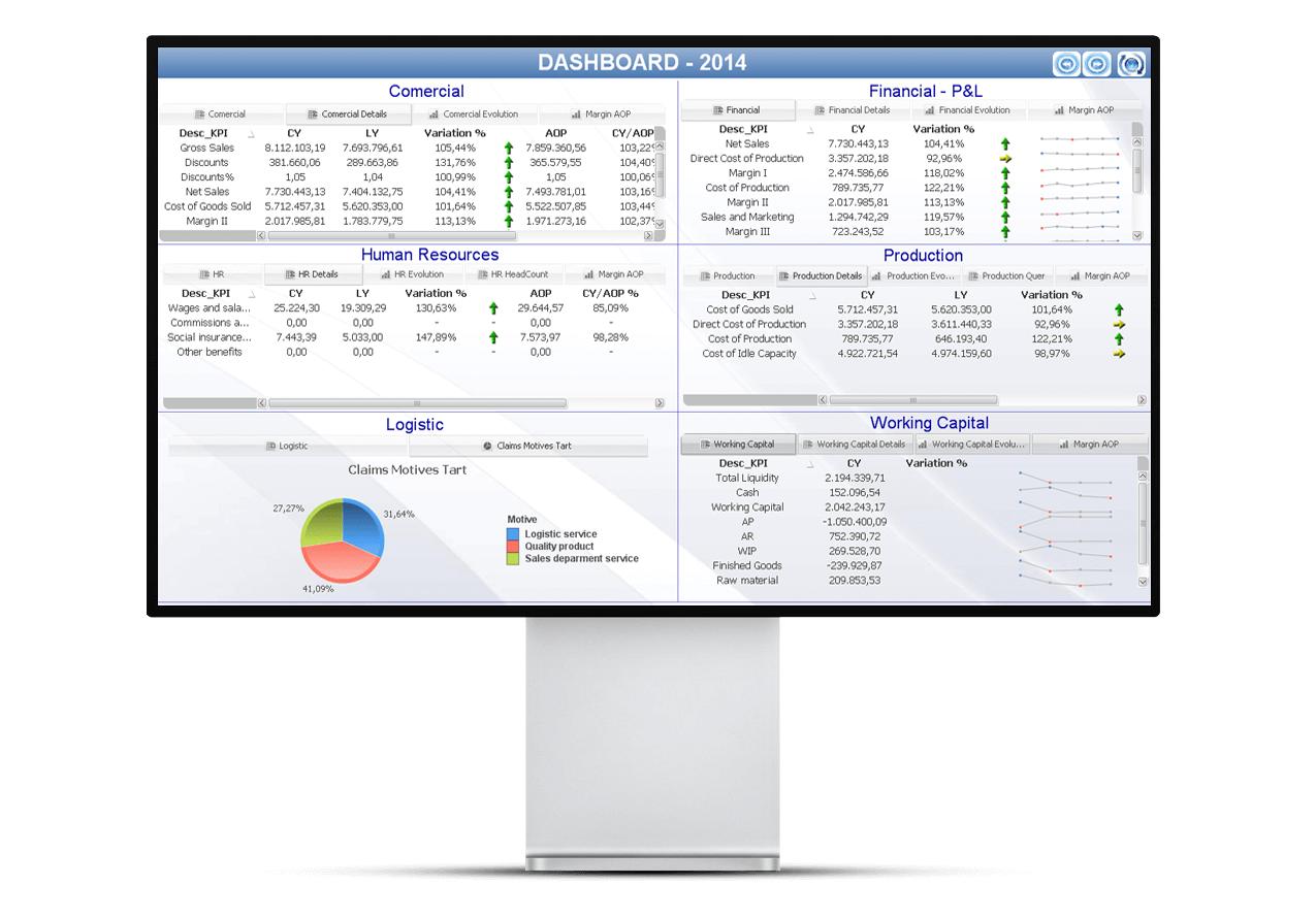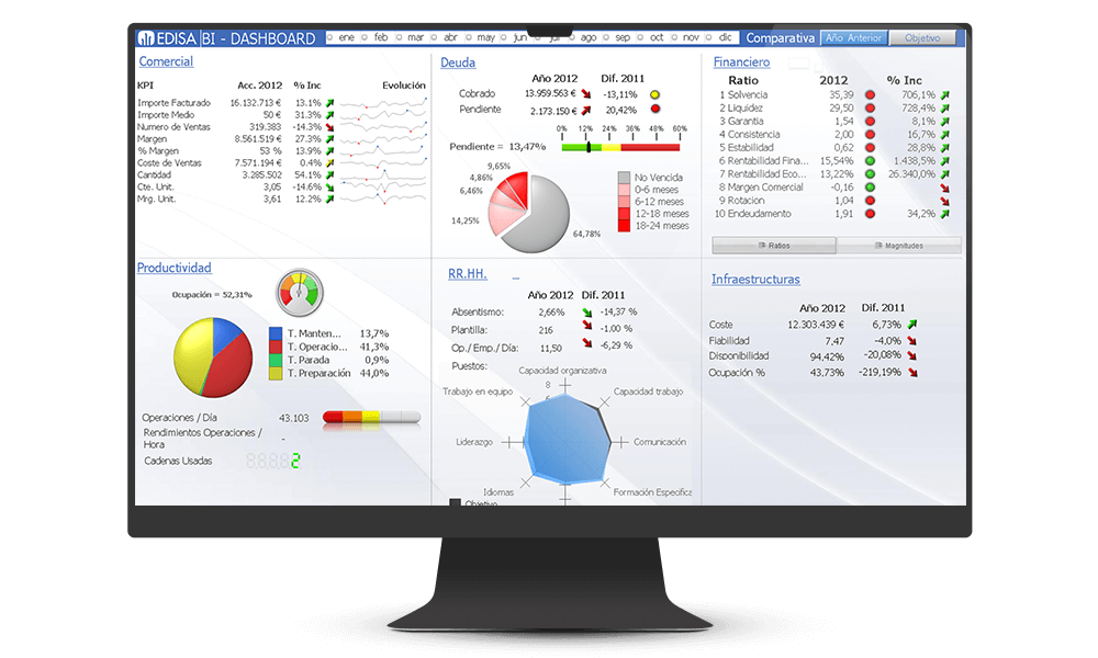 Le permitirá ver evoluciones y tendencias, medir resultados frente a objetivos y tomar decisiones estratégicas y tácticas basadas en la información real de su negocio. Así como hacer un seguimiento de las decisiones tomadas para verificar el curso de su empresa en el momento preciso.