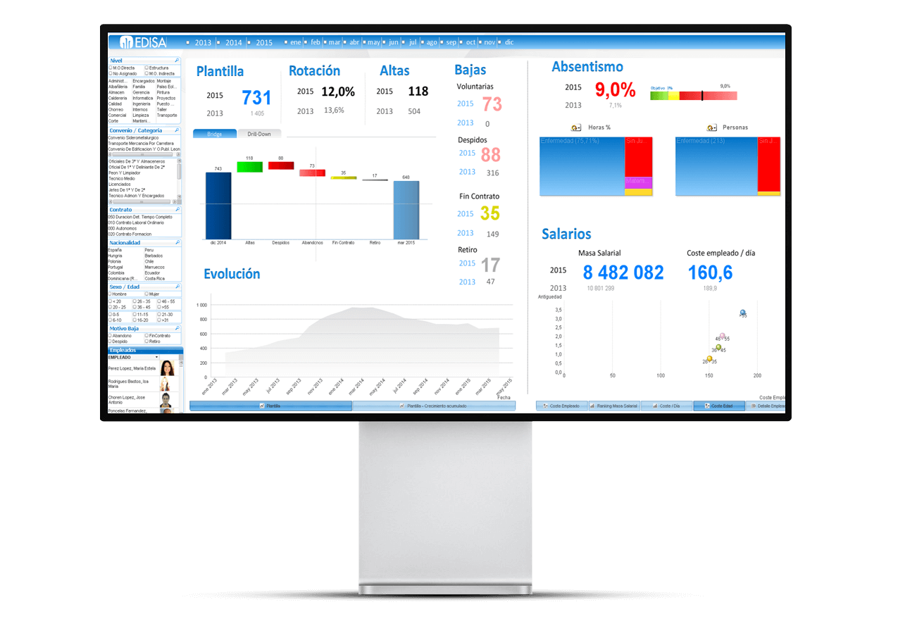 - Ficha del trabajador con toda la historia dentro de la empresa y su evolución (departamentos, puestos, formación, nivel salarial, costes, absentismos, contratos, etc.).
