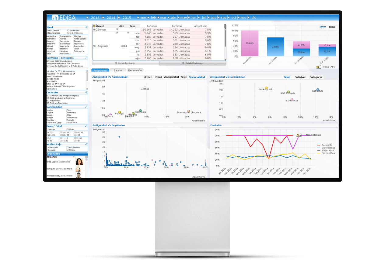 Gracias a nuestras soluciones, se puede controlar la evolución de la organización desde distintas perspectivas y en función del perfil de cada usuario. Una navegación intuitiva por la información, desde los niveles más agregados, hasta el detalle final – que puede ser una nómina en concreto, la ficha del empleado o una fecha o un curso en concreto – ayuda a optimizar la gestión ya que comprende la información de las diferentes áreas a controlar.