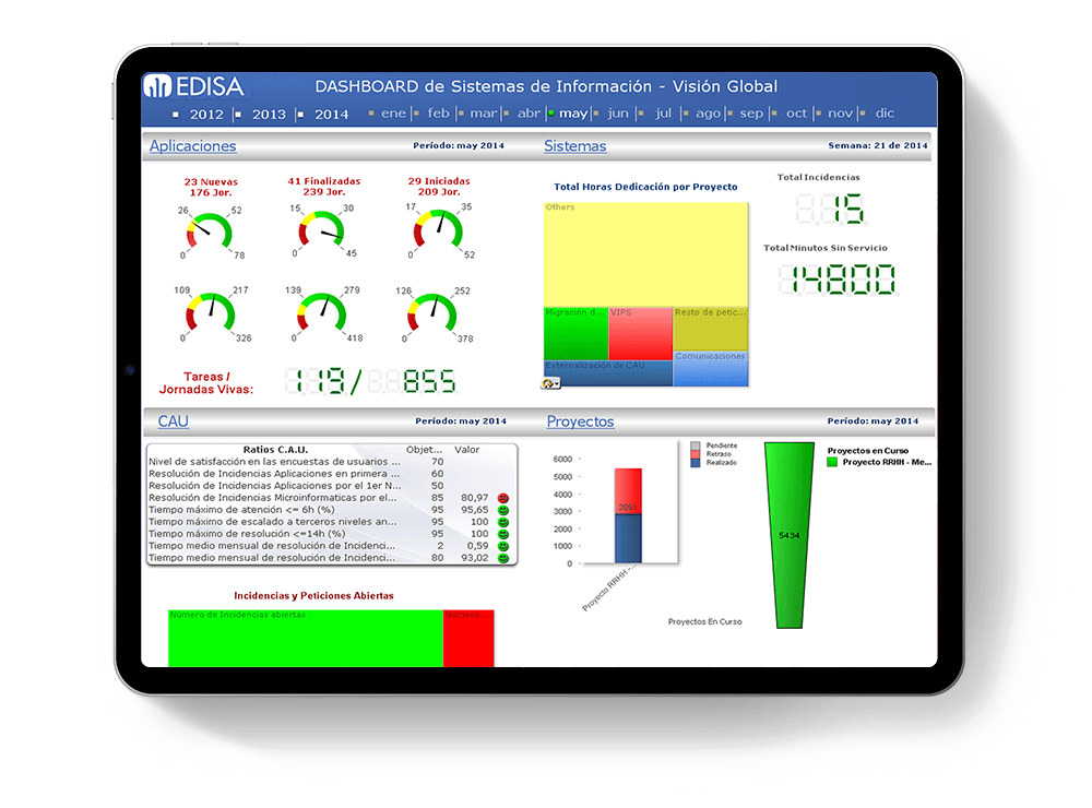 Como aspectos más críticos del área de gestión de sistemas destacan la disponibilidad y seguridad de los sistemas y la eficiencia de sus servicios. El Cuadro de Mando IT monitoriza los aspectos más importantes de los sistemas de información para su conocimiento profundo y gestión eficiente.