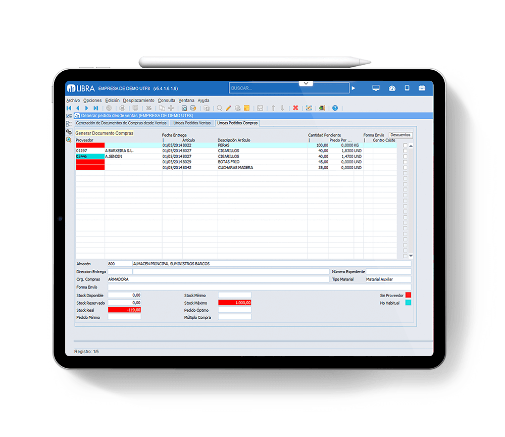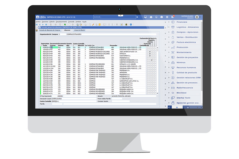 El módulo de Gestión Compras de LIBRA ERP permite gestionar todos los procesos relacionados con la Compra-Aprovisionamiento de materias primas, productos, elementos de inmovilizado y/o servicios, incluyendo la gestión de solicitudes de compra, la gestión de pedidos y su recepción, la entrada de albaranes y facturas, y su contabilización.