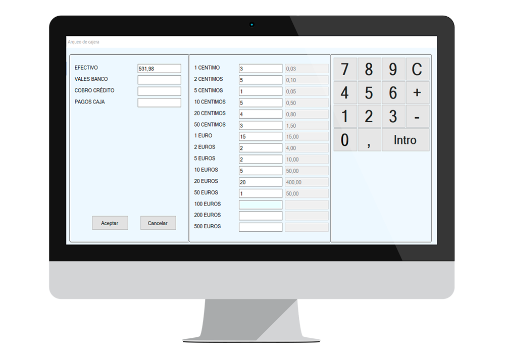 La gestión front office de LIBRA TPV permite gestionar y controlar toda la operativa diaria de los usuarios que están en la caja: